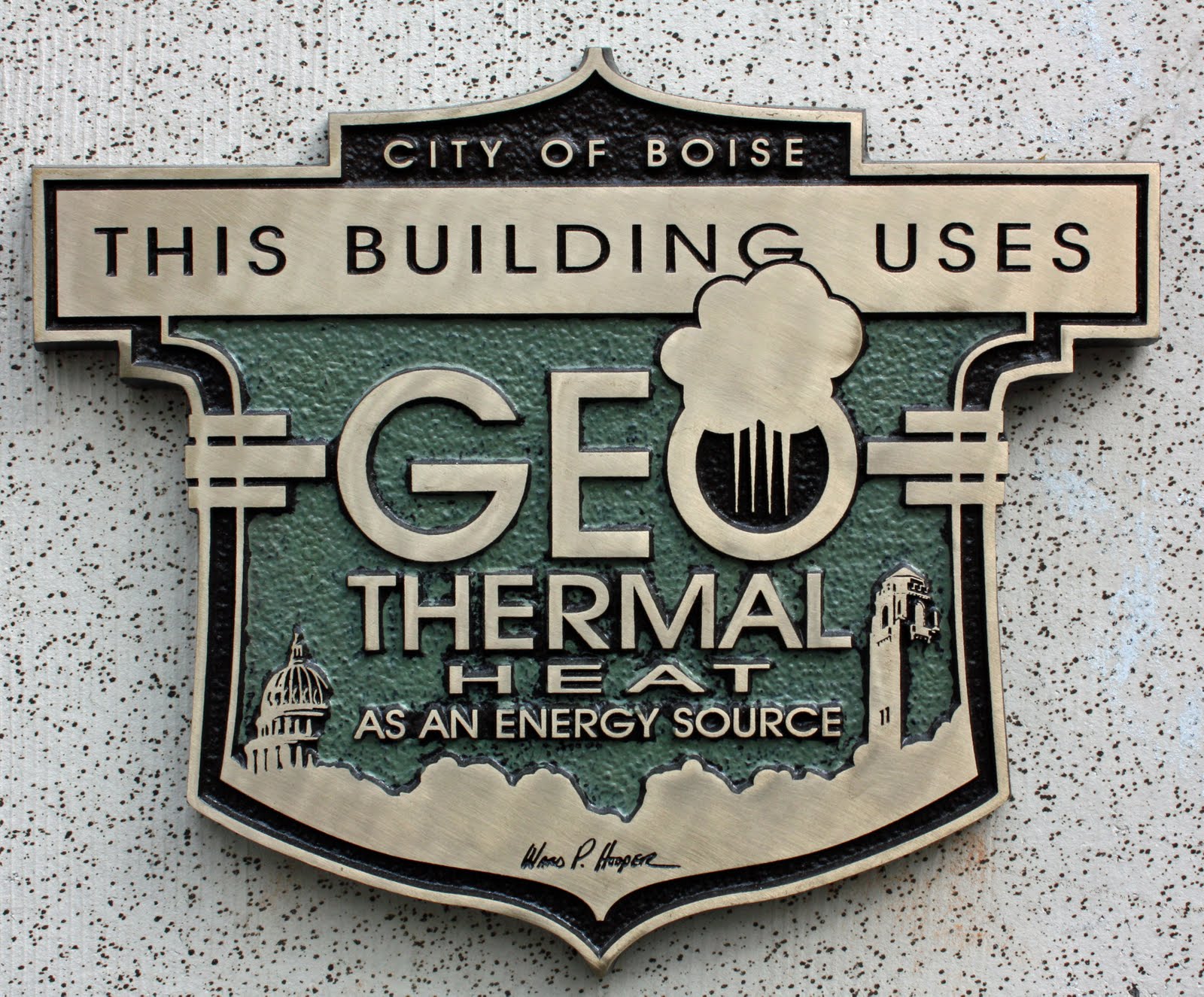 A plaque for buildings using energy from geothermal heat systems was designed by Boise artist Ward Hooper.